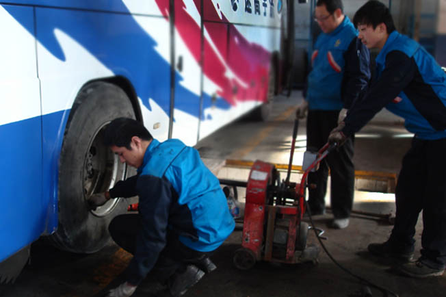 在汽车保修厂检测线采访小组观看了班车安全检测的全过程