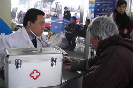 总站南区党、团员志愿者在车站周边公交站牌,准备了轮椅、一次性纸杯、捆扎绳等便民用品,为旅客们提供免费行李运送、公交线路咨询等服务;在旅客进站口、中转旅客咨询处设立了“问不倒”岗,为旅客提供乘车、售票、景区、医院等咨询服务;车站医务室党员魏德泉在候车长廊内设立了便民医疗咨询服务站,为乘车旅客提供头疼脑热、晕车等便民服务,受到了广大旅客的一致好评。