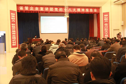 按照省委、省国资委统一部署,12月19日,“省管企业宣讲团党的十八大精神报告会”在集团公司多功能厅隆重举行,集团公司董事长、党委书记吴宗昌以及集团领导班子成员、基层各单位中层以上领导干部160余人参加了报告会。