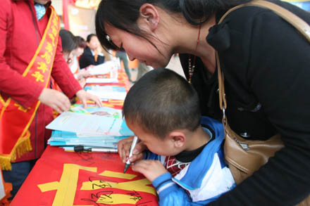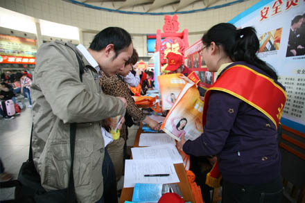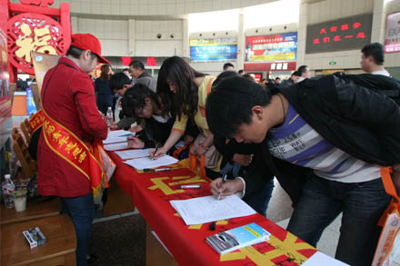 在总站候车大厅关注灾区群众、祈福平安签字现场,设置了气象灾难、气象预警及预防科普知识展板,志愿者将宣传材料发放到每一名旅客手中,并邀请他们在签名条幅上写下对雅安地震灾区群众的祝福话语和姓名,为雅安的灾区人民祈福。
