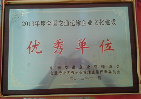 11月25日,在中国交通企业管理协会、交通行业优秀企业管理成果评审委员会在广州组织召开的“第八届全国交通运输企业文化建设高峰会”上,集团公司荣膺“2013年度全国交通运输企业文化建设优秀单位”荣誉称号。