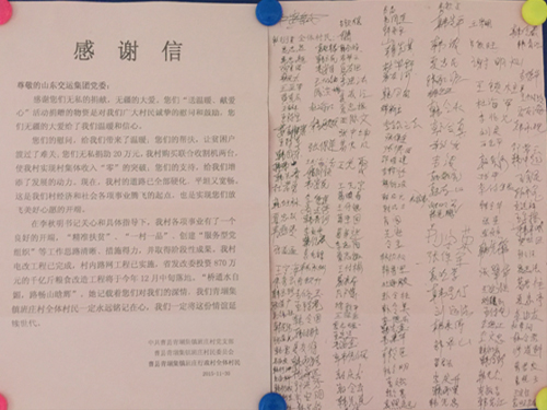 您现在的位置是:千亿(中国) > 集团要闻 集团党委收到“第一书记”帮扶贫困村感谢信 次 集团要闻 发布时间:2015-12-11 16:05:56 集团党委收到 “第一书记”帮扶贫困村感谢信 近日,集团党委收到一封来自菏泽曹县青堌集镇班庄村党支部、村民委员会和全体村民的联名感谢信。信上密密麻麻写满204名村民的签名,他们怀着无比感激的心情,用最质朴的方式,表达了全体村民对集团党委在 “第一书记”扶贫帮扶工作中“真心实意办实事、扶贫济困见真情”的感激之情。