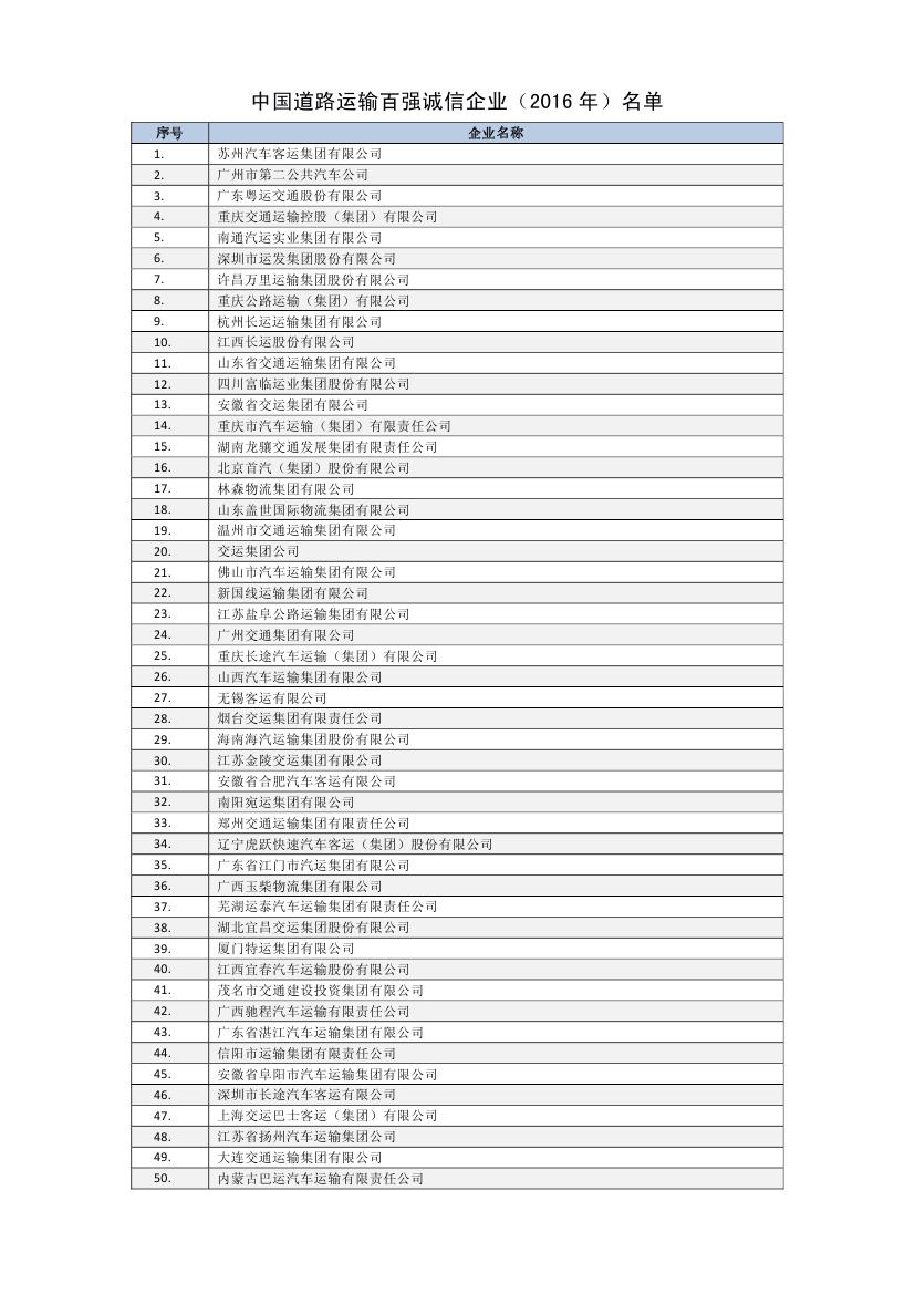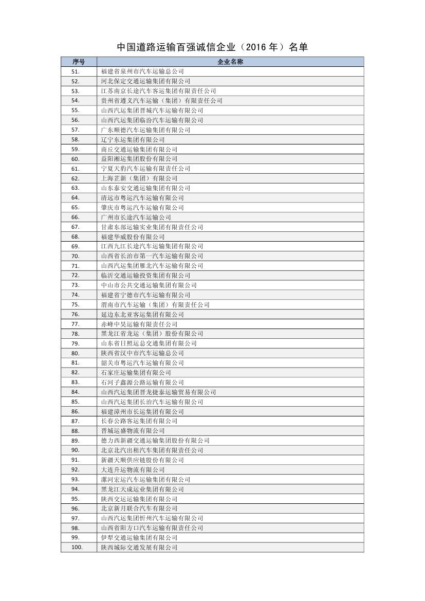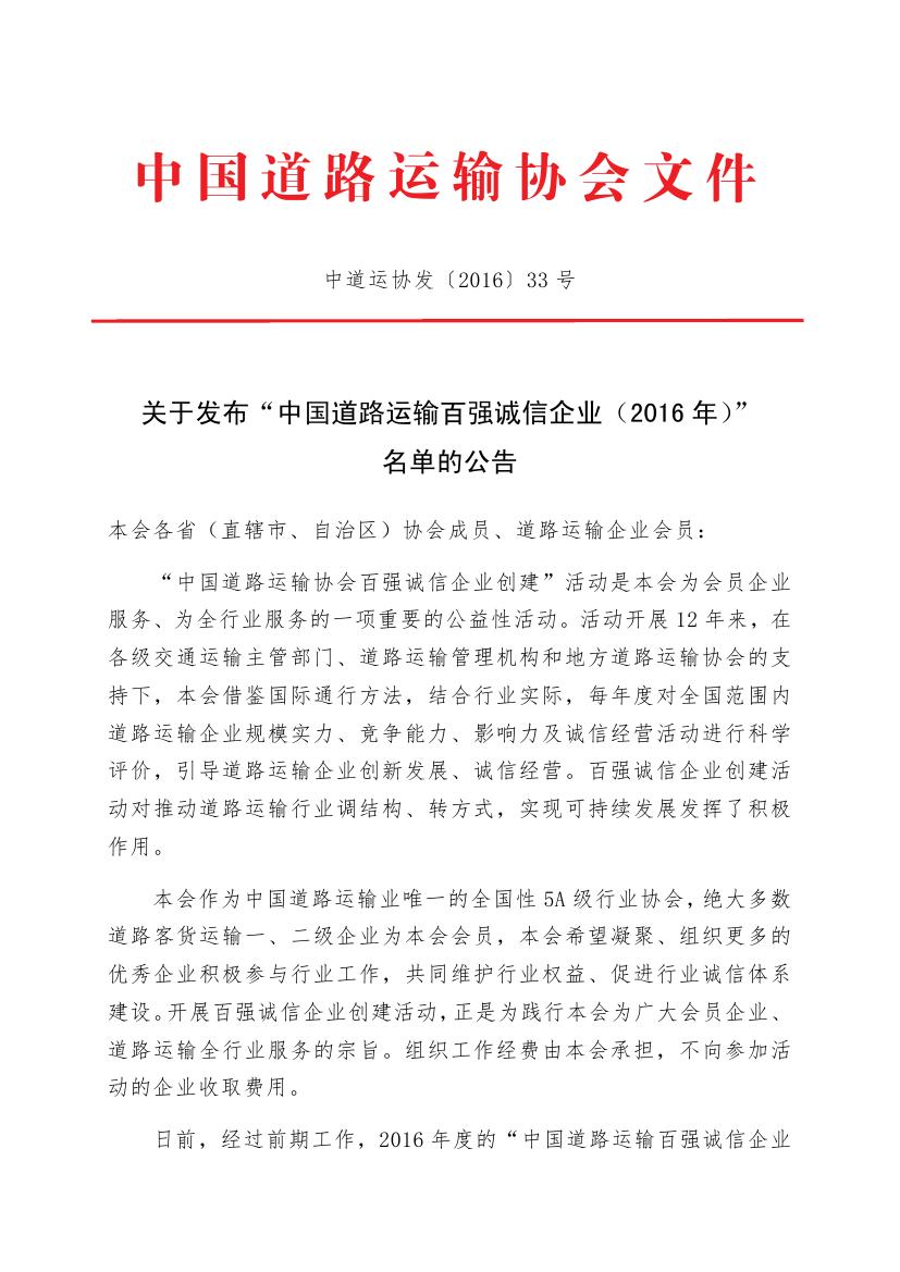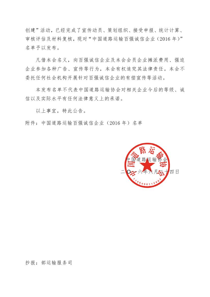 6月24日,中国道路运输协会发布了2016年度道路运输百强诚信企业名单,集团再度荣获“全国道路运输百强诚信企业”称号,排名第十一位,比去年前进一个名次。