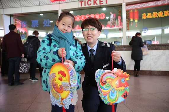 “鸡”祥灯笼照亮旅途 近日,在济南长途汽车总站乘车的高研欣小朋友开心地收到售票员送上的“鸡”祥灯笼,这是总站为配合元宵节运输开展的“唱儿歌送吉祥”活动,活动规定从即日起至正月十五,凡在总站购票的小朋友,只要能唱出与元宵节相关的儿歌,即可获赠“鸡”祥灯笼一个,为旅途增添节日了一份节日的欢乐。