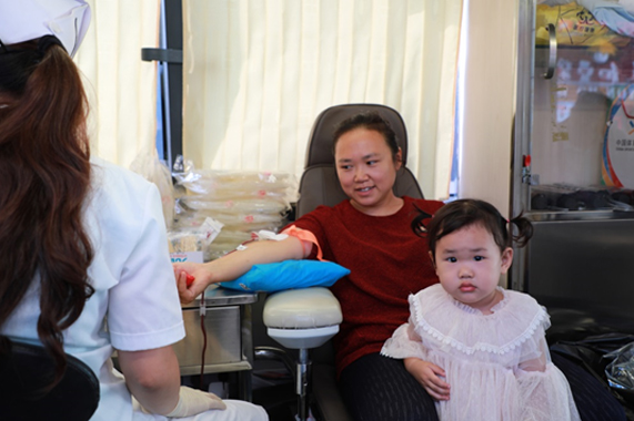 在献血现场,有一个两岁的小姑娘引起了我们的注意,有点害羞的她躲在一位老人身后。本以为是过往的旅客,可是后来得知她是交运石化公司员工赵欣的女儿,知道妈妈要献血,懵懵懂懂的她也来到现场,感受妈妈是如何尽己之力帮助别人的!