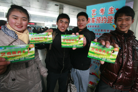 在售票处,总站专门 为增设了“艺考生购票窗口”,就青岛、潍坊、淄博、曲阜等艺考线路,向艺考生提供优惠和优先的购票服务。为方便众多艺考生在多个考点城市中转乘车,总站还在艺考生中转赶考集中的43号检票口,特别设立了“艺考生服务台”,并推出预约乘车、送艺考生赶考的便捷服务,艺考生只需凭借准考证,即可享受优先预订中转客票、优先乘车的“预约赶考服务”