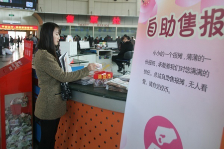 您现在的位置是:千亿(中国) > 客运场站产业 自助售报点传递正能量 次 客运场站产业 发布时间:2013-11-11 08:55:14 自助售报点传递正能量 近日,济南长途汽车总站在候车大厅设立了自助售报点,发售《齐鲁晚报》、《济南时报》、《都市女报》等省内各大报纸,由旅客诚信购买,吸引了不少旅客关注,很多人被这小小售报点传递出的诚信与公德的展现所感染,自觉投币买报。 (总站宣)