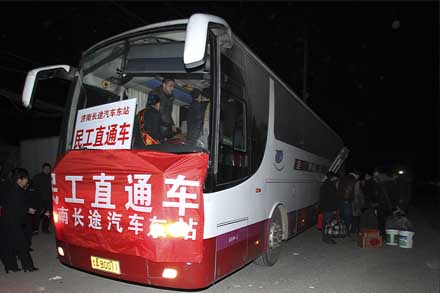 1月22日,汽车东站发出春运第一辆“民工直通车”,十六里河建筑工地的30多名农民工朋友不出工作场地,直接坐上了返回家乡安徽池州的直达班车。为做好这次直通车营运,东站提前做好周密细致的工作计划,对车辆的审核、安全检查、安全器械的配置和驾驶员资质都做了严格要求,同时车上还配备了急救药箱等应急物品,确保农民工朋友平安顺利返乡。2014年春运,汽车东站准备了十余辆班车待命,并通过联系市内各建筑工地,计划开出“民工直通车”20班,切实帮助农民工朋友顺利返乡。