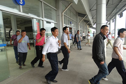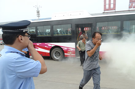 此次应急预案演练共设置了“车辆自燃突发事件演练”、“火灾逃生演练”、“反恐防爆演练”、“消防灭火演练”等多个演练科目。“车辆突发事件演练”模拟客运车辆突发自燃事件,现场工作人员立即启动应急预案,灭火小组迅速展开灭火,疏散引导组引导乘客逃生;“火灾逃生演练”模拟候车室着火,现场工作人员迅速拨打119报警求助,并引导演练人员用毛巾等物品捂住口鼻,快速有序安全逃生;“反恐防爆演练”在候车室内进行,由工作人员用钢叉等反恐器材制服出现在候车室内的暴徒;“消防灭火演练”在车场空地设置着火点一处,演练人员每五人一组进行灭火器灭火演练,消防救援组进行消防水枪灭火演练,应急救援组进行人员、物资抢救,重点检验灭火器、消防水枪的用法。