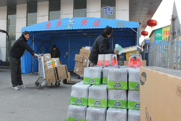 2月2日是小年后的第二天,从总站南区发往省内各地的货物开始激增,主要以各类食品为主。兔兔快运迅速设立专门区域存放、值守,特别是对啤酒一类玻璃容器货物,更是严格按照码放标准存放,避免因碰撞、坠落等原因而损坏,并确保在运输途中得到全程监管。针对蔬菜、海鲜等时令生鲜类货物,开辟了“快速”通道,优先收取和送达。